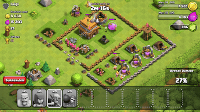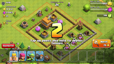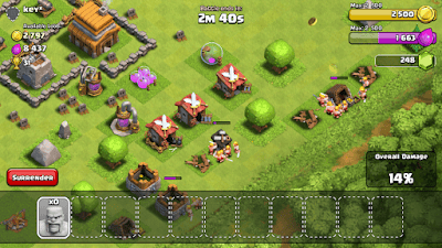 Agar lebih cepat mengumpulkan gold dan elixir , kamu harus menyerang desa lain, pilihlah desa yang memiliki simpanan modal yang banyak, minimal 3000 dan memiliki defense yang lemah, lihat contoh serangan yang admin lakukan di gambar di bawah.